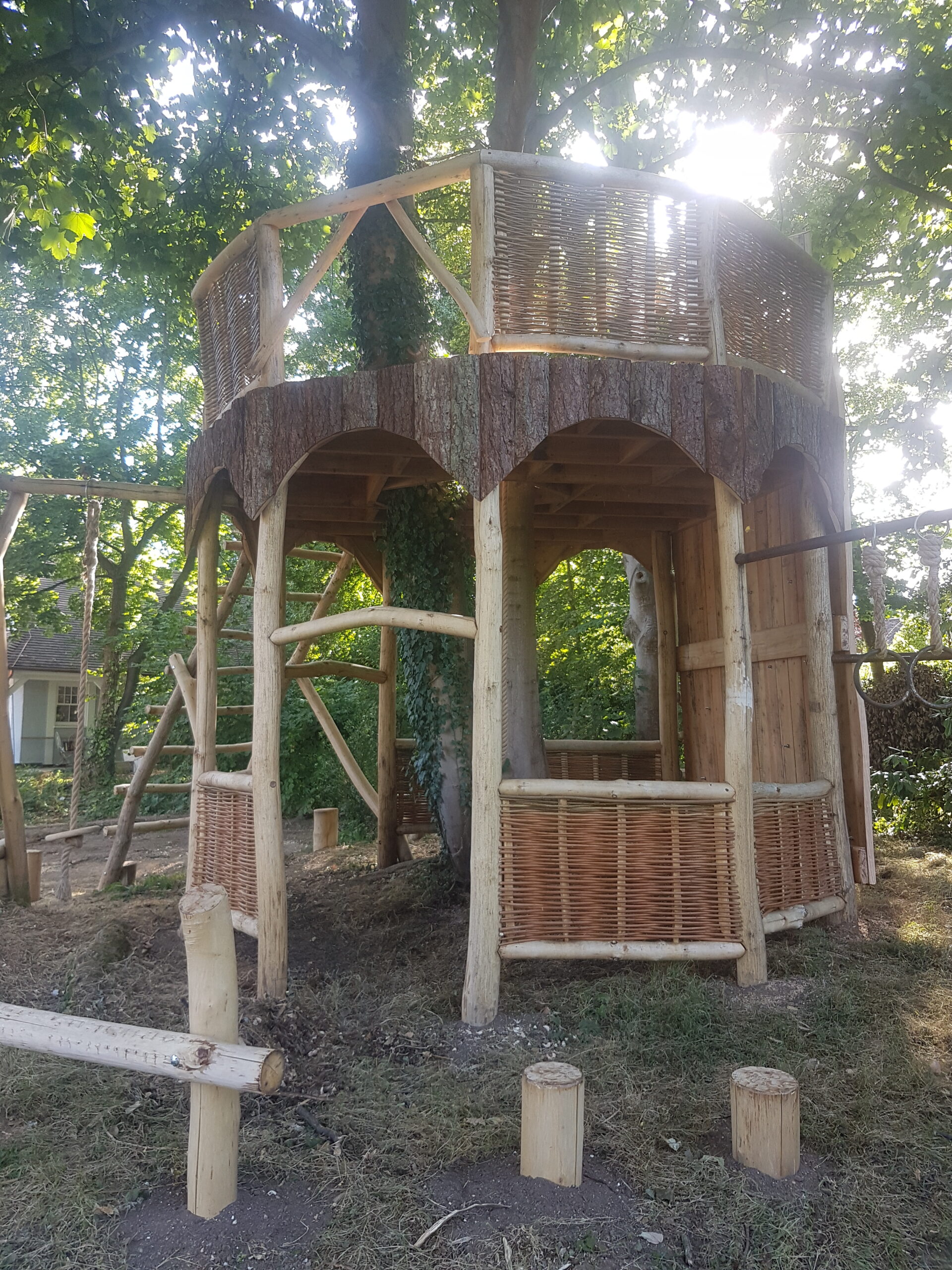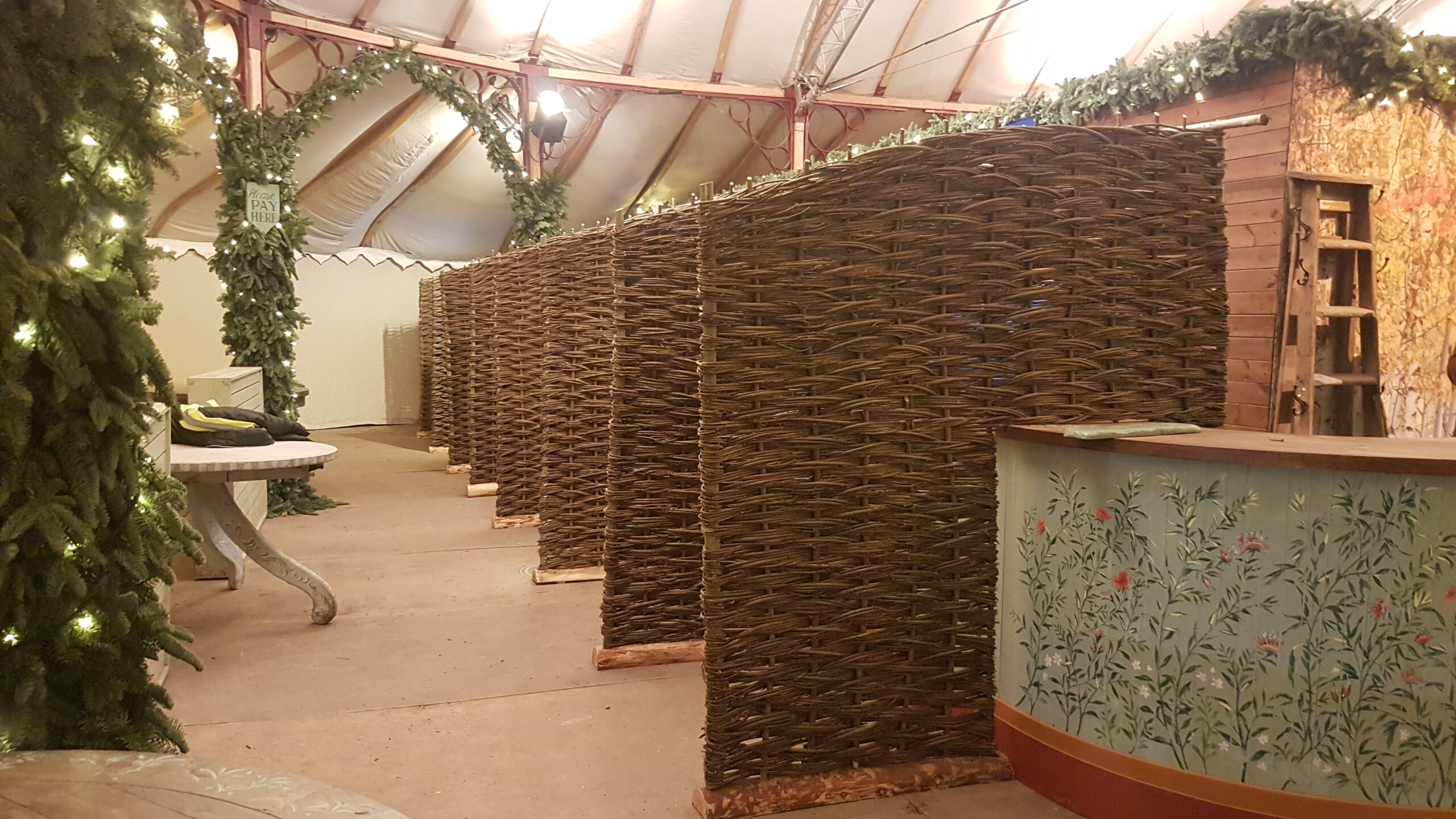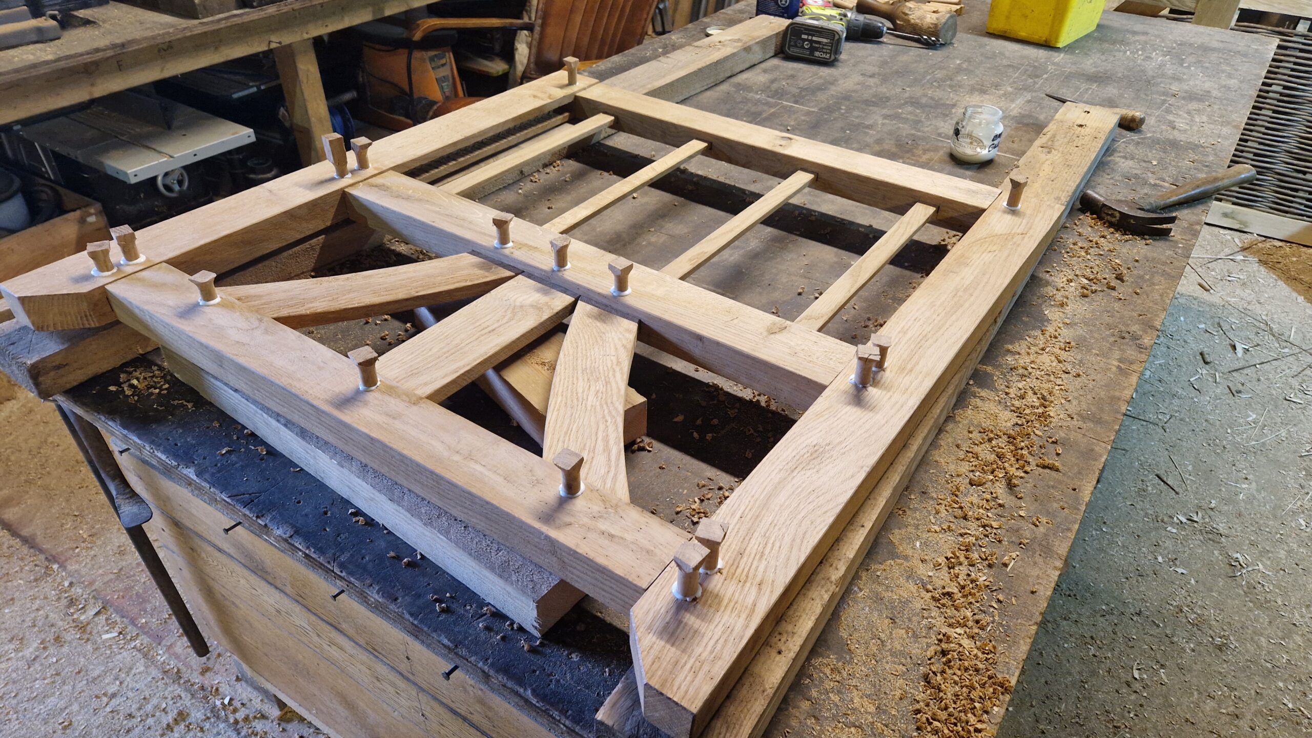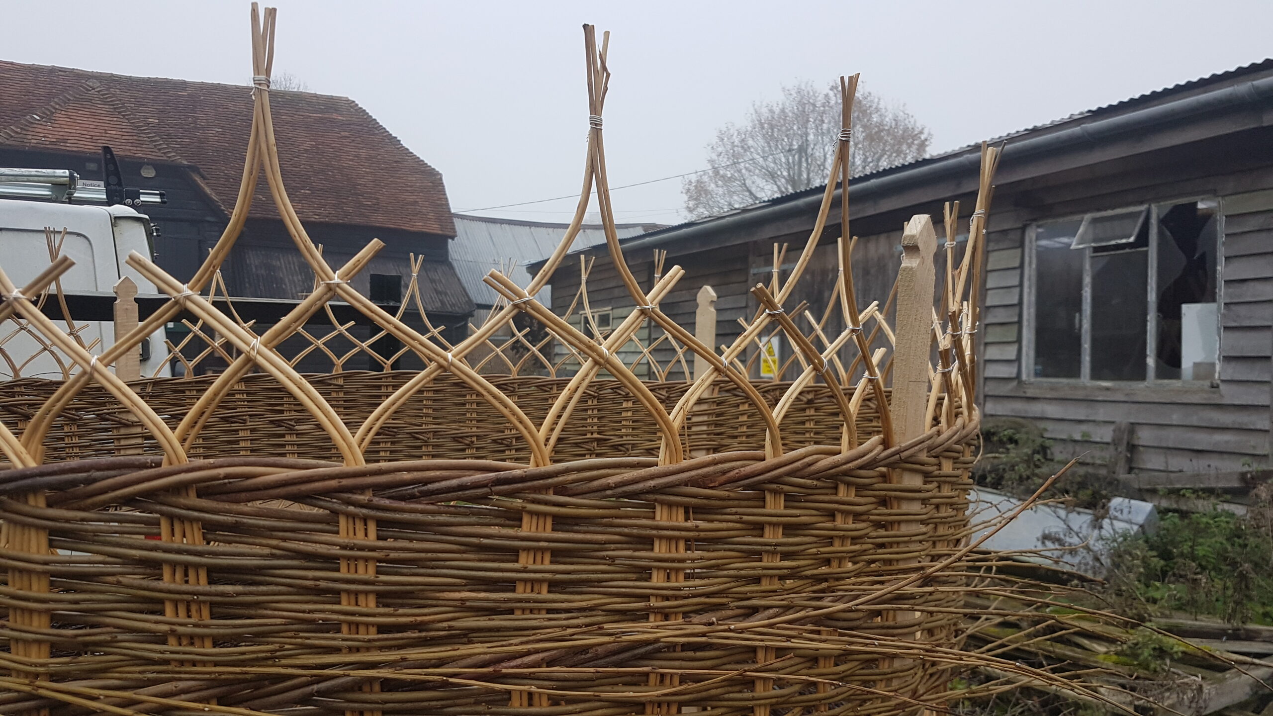 All timber cutting, shaping, sawing and joining is carried out in our well equipped workshop. Be it a simple framed hurdle, a tree seat or a complex mortice & tenon gate frame. This way we can make sure everything is just right to receive the final willowy touch!